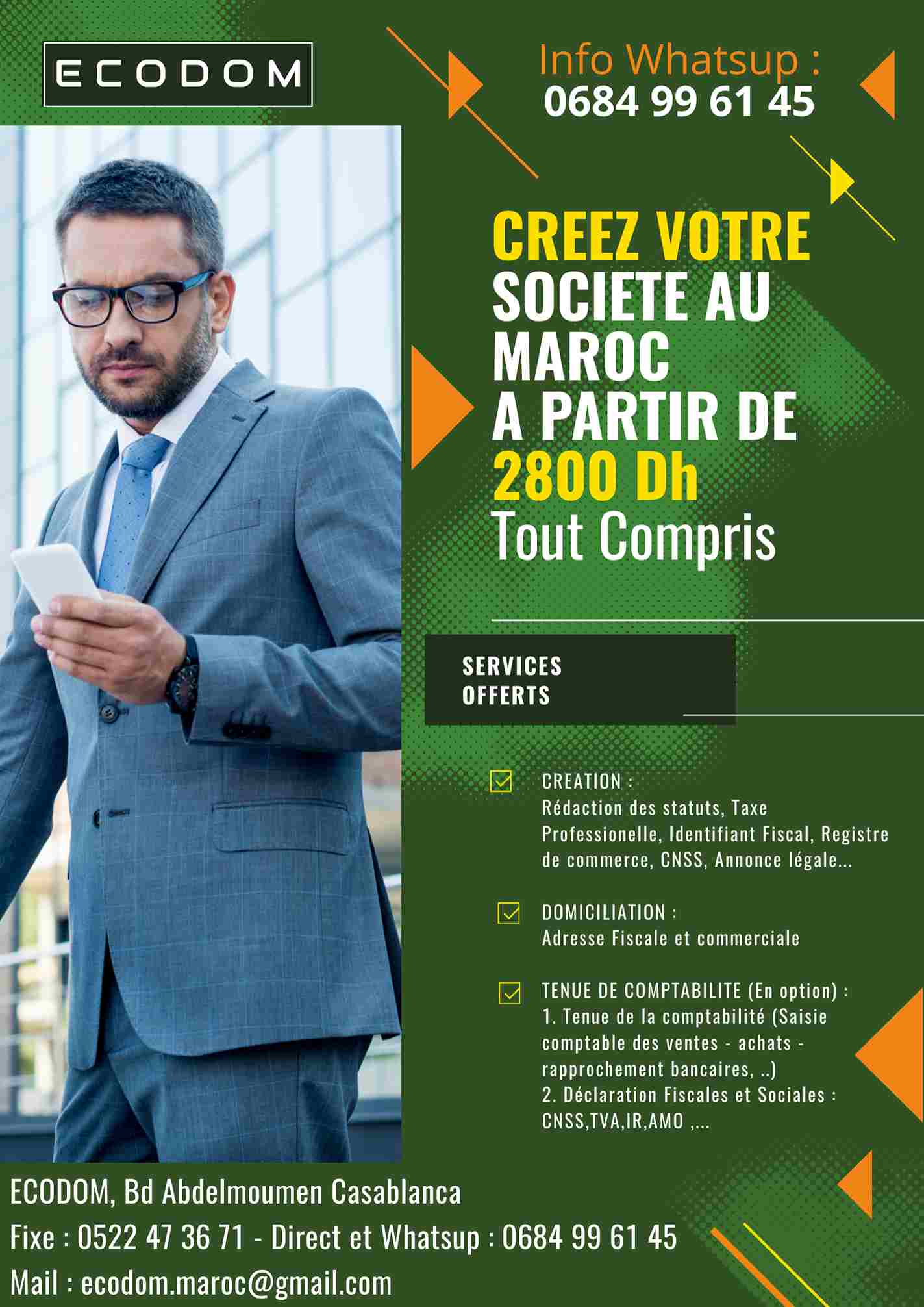 - une adresse souvent moins « prestigieuse » et éloignée des centres d'activité. L'auto entrepreneur au Maroc peut aussi établir son siège social dans des locaux commerciaux ou des bureaux. Mais, il n'est pas toujours possible de louer des locaux surtout pendant la phase de démarrage, dans ce cas, il y a une solution alternative qui s'appelle la domiciliation d'entreprise ou plus précisément la domiciliation juridique d'entreprise.